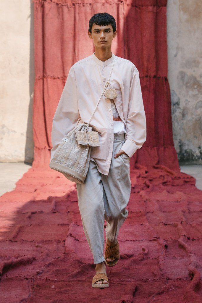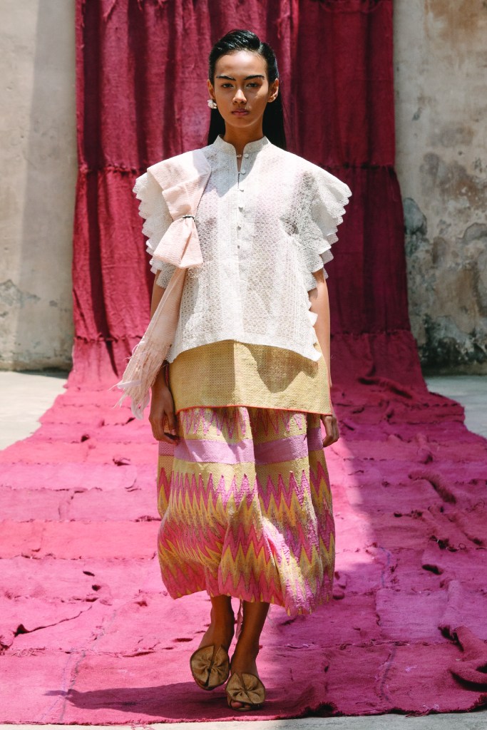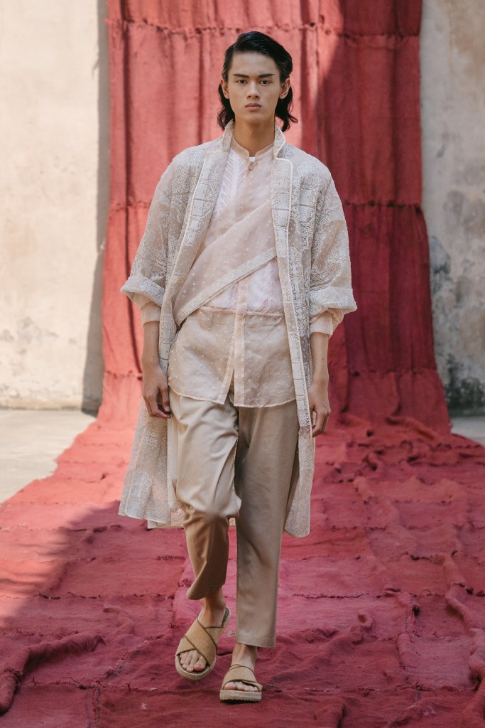 Yang istimewa dalam koleksi ini adalah inspirasi berdasarkan budaya nusantara—yang sebelumnya memang sering diangkat oleh Sapto dalam koleksi-koleksinya–yang kali ini ia dapatkan dari tradisi keagamaan di Bali, yaitu Sabung Ayam atau tajen. Inspirasi ini ditemukannya dari hasil membaca buku-buku sejarah selama pandemi. Lepas dari kontroversi terkait tradisi tersebut, Sapto mendapati tradisi sabung ayam sangat menarik untuk diterjemahkan secara visual ke dalam karyanya. Hal ini tercerminkan dalam salah satu gaun sepanjang betis yang menggunakan material creative fabric menyerupai anyaman keranjang yang tersusun dari kain organza yang dipotong secara individu, serta dilengkapi dengan detil tusuk silang hasil sulaman tangan. Detil sulaman tangan juga dihadirkan dalam bentuk ayam jago, pola acak yang dinamis dan guratan menyerupai sapuan kuas.