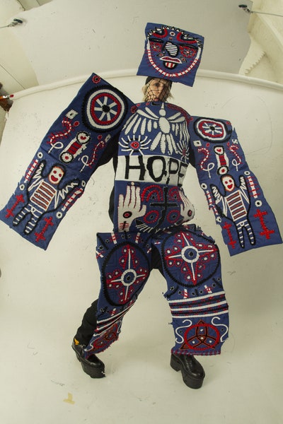 Terdapat tiga look dari keseluruhan koleksinya yang paling menarik perhatian. Ketiga look tersebut terbuat dari material sejenis felt yang dipenuhi sulaman patchwork dengan ornamen bernuansa tribal dan simbol terkait paganisme serta identitas gender khas LOVERBOY, dengan bentuk yang sekilas menyerupai pakaian adat atau kostum perang tradisional. Dan memang ternyata, bentuk pakaian tersebut terinspirasi dari The Burryman, sosok dalam sebuah ritual tradisional Skotlandia, di mana tubuh seorang pria ditutupi dengan tanaman burdock hingga ke wajah mereka, yang dianggap sebagai simbol penangkal roh jahat. Ketiga garmen ini masing-masingnya menampakkan tiga teks besar yang juga terbuat dari sulaman, yaitu ‘HOPE’, ‘HEALTH’, dan ‘COMMUNITY’. Dalam proses pembuatannya, Charles Jeffrey juga berusaha memanfaatkan situasi lockdown, di mana ia tidak bisa berinteraksi secara langsung dengan para asistennya. Ia pun mendesain setiap look tersebut dengan aplikasi patchwork yang memungkinkan untuk dikerjakan para asistennya di rumah masing-masing. Pengerjaan secara jarak jauh tersebut pun berhasil diwujudkan dengan memakan waktu selama lima bulan.
