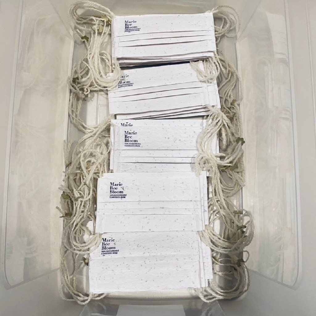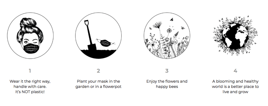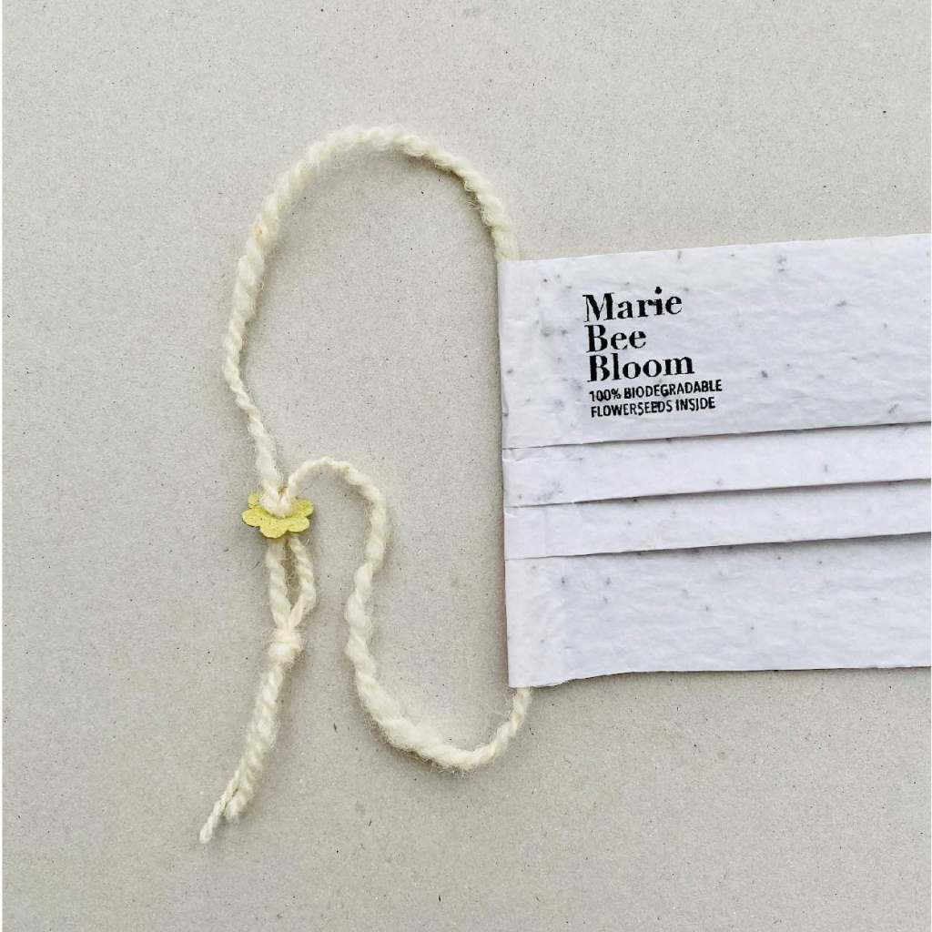 Mengangkat tajuk #Bloomtheworld, seluruh material yang digunakan untuk memproduksi masker ini, mulai dari tali telinga hingga tinta yang digunakan untuk menulis merek masker, menggunakan bahan organik yang baik untuk lingkungan. Dibuat oleh sebuah studio lokakarya komunitas di Belanda, permukaan masker terbuat dari kertas beras (rice paper) yang dicampur oleh tujuh variasi benih bunga liar asal Belanda seperti desi, petunia, juga baby’s breath. Pekerjaannya sebagai desainer grafis membuat Marie terinspirasi oleh penggunaan kertas-kertas daur ulang yang mengandung benih bunga yang sering digunakan sebagai material kartu undangan. Namun untuk membuat sebuah masker yang nyaman digunakan, Marie mencari material kertas yang tipis dan ringan hingga mudah dilipat dan dibawa, yang kemudian ia temukan pada kertas beras.