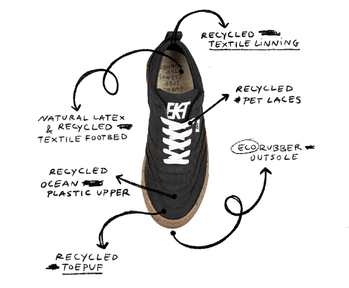 Bagian sol sepatu terbuat dari 70 persen sampah karet yang dicampur dengan karet baru untuk memastikan sepatu ini dapat bertahan lama. Untuk bagian atas serta tali sepatu, kain yang digunakan adalah polyester yang diproduksi menggunakan limbah plastik dari Laut Mediterania. Material non-daur ulang lainnya yang ditambahkan hanyalah kapas organik yang digunakan sebagai benang jahitan, bordir, dan membuat label sepatu. Sol bagian dalam yang terbuat dari latex alami membuatnya memiliki sifat dapat terurai, namun selebihnya, bagian lain dari sepatu ini dibuat agar mudah didaur ulang kembali. Effekt Footwear juga memiliki sebuah kampanye yang disebut Effekt Collekt, di mana para konsumennya dapat mengembalikan sepatu mereka untuk didaur ulang dan akan digunakan pada produksi sepatu yang lain.