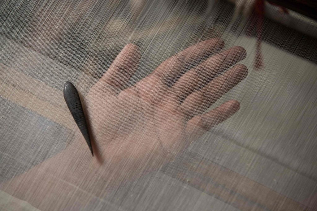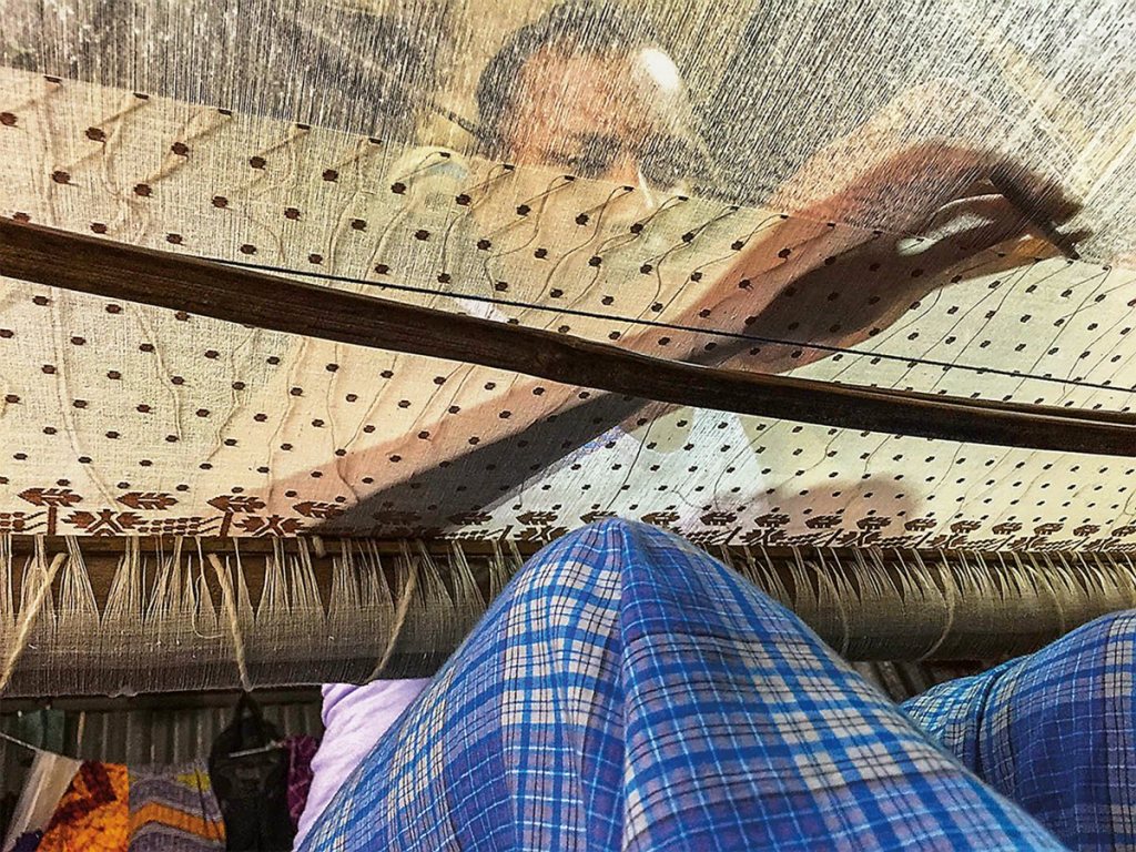 Terakhir, setelah benang-benang halus telah terkumpul, saatnya proses tenun dimulai. Proses ini membutuhkan waktu paling lama, minimal dua bulan. Dengan menggunakan dhunkar, sebuah busur bambu yang diikat menggunakan kawat, para penenun dengan teliti membentuk pola di atas benang tenun tersebut.